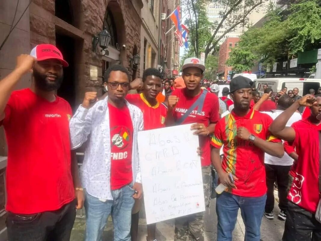 À l’appel du Front National pour la Défense de la Constitution (FNDC), une foule massive s’est mobilisée ce mardi devant l’ambassade de Guinée à New York. Les manifestants, en grande majorité des jeunes, ont scandé des slogans tels que « Doumbouya zéro, libérez Foniké, libérez Billo ». La manifestation s’est ensuite dirigée vers le siège de l’ONU à Manhattan pour porter leurs revendications à l’échelle internationale.