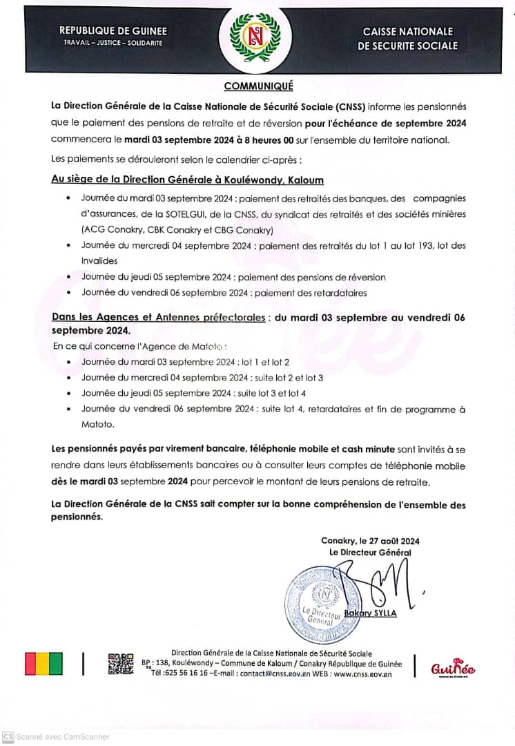 Se connecter Bienvenue ! Connectez-vous à votre compte : votre nom d'utilisateur votre mot de passe Forgot your password? Get help Récupération de mot de passe Récupérer votre mot de passe votre email Un mot de passe vous sera envoyé par email. ActualitéLes annonces Pensions des retraités : la CNSS annonce la date de l’échéance de septembre Publié par laguinee.info 28 août 2024 Share FacebookTwitterPinterestWhatsAppLinkedinEmailPrintViber Siège du CNSS de Guinée À LIRE AUSSI Desserte en courant électrique : le Général Mamadi Doumbouya tape du poing sur la table ! (Confidences) 4 juillet 2024 Filets fatigués, poissons rares: les pêcheurs de Koba dans l’impasse ! 20 avril 2024 Koba: immersion dans l’univers des producteurs artisanaux du sel 19 avril 2024 Le gombo, le trésor vert de la sous-préfecture de Koba ! 18 avril 2024 laguinee.infohttps://laguinee.info Share FacebookTwitterPinterestWhatsAppLinkedinEmailPrintViber Article précédentBurkina Faso : un ancien légionnaire français soupçonné d’espionnage, arrêtéArticle suivantKankan : le ministre de l’Énergie relance le projet de centrale solaire - Advertisement - ECHO DE NOS RÉGIONS Retour de mission mouvementé : frayeur pour Elhadj Fodé Madjaye Magassouba après un accident à Tapiyoka 23 février 2026 Kindia : un incendie ravage plusieurs hectares d’ananas, un exploitant agricole lance un appel à l’aide 22 février 2026 N’Zérékoré : une famille dévastée par un incendie en pleine saison sèche appel au secours 20 février 2026 « Quand je suis arrivé, j’ai entendu des femmes pleurer… il était dans un état vraiment critique » : témoignage sur la mort d’un... 19 février 2026 Kissidougou : le sac de ciment atteint 120 000 GNF dans les magasins 19 février 2026