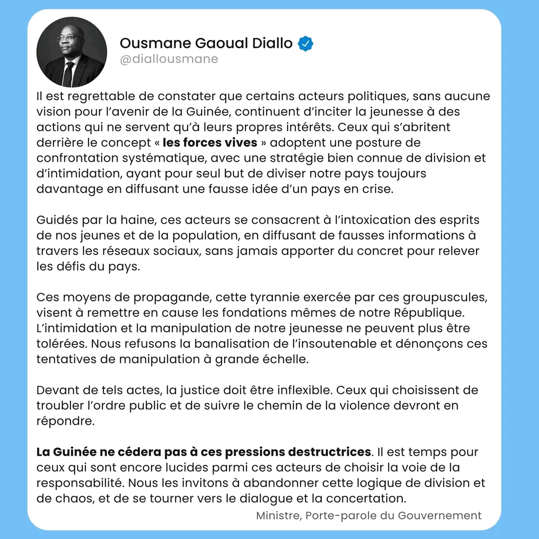 Le ministre a conclu en appelant ces acteurs à la responsabilité et au dialogue, affirmant que « La Guinée ne cédera pas à ces pressions destructrices. Il est temps pour ceux qui sont encore lucides parmi ces acteurs de choisir la voie de la responsabilité. Nous les invitons à abandonner cette logique de division et de chaos, et de se tourner vers le dialogue et la concertation. »