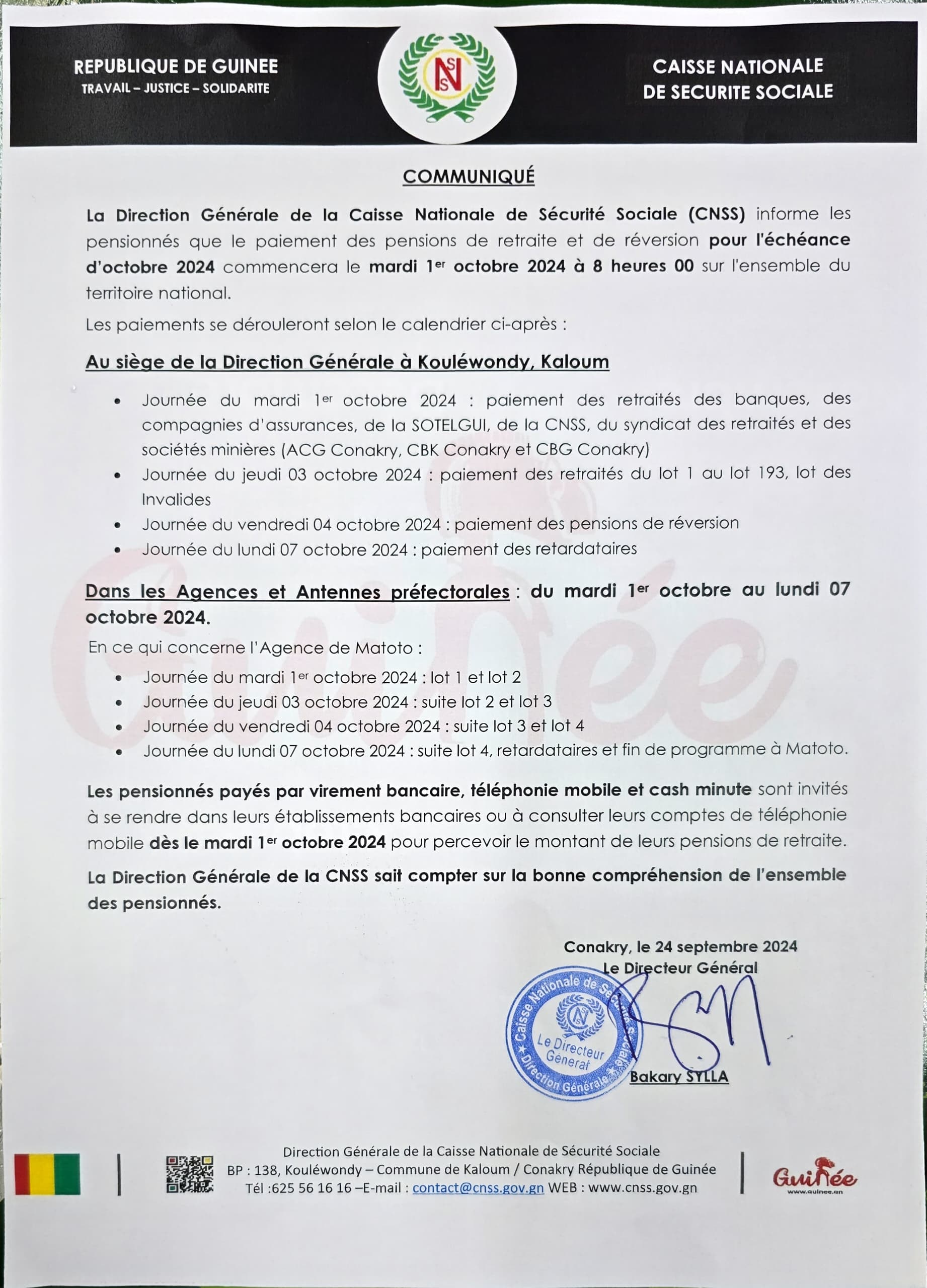 Se connecter Bienvenue ! Connectez-vous à votre compte : votre nom d'utilisateur votre mot de passe Forgot your password? Get help Récupération de mot de passe Récupérer votre mot de passe votre email Un mot de passe vous sera envoyé par email. ActualitéLes annonces CNSS-Pensions des retraités : le paiement pour l’échéance d’octobre annoncée (communiqué) Publié par laguinee.info 26 septembre 2024 Share FacebookTwitterPinterestWhatsAppLinkedinEmailPrintViber Siège du CNSS de Guinée À LIRE AUSSI Desserte en courant électrique : le Général Mamadi Doumbouya tape du poing sur la table ! (Confidences) 4 juillet 2024 Filets fatigués, poissons rares: les pêcheurs de Koba dans l’impasse ! 20 avril 2024 Koba: immersion dans l’univers des producteurs artisanaux du sel 19 avril 2024 Le gombo, le trésor vert de la sous-préfecture de Koba ! 18 avril 2024 laguinee.infohttps://laguinee.info Share FacebookTwitterPinterestWhatsAppLinkedinEmailPrintViber Article précédentMort du Colonel Pépé Celestin Bilivogui : le Forum des Forces Sociales exige des explications Article suivantConakry: Dr Dansa Kourouma, son discours et la réalité ! - Advertisement - ECHO DE NOS RÉGIONS Retour de mission mouvementé : frayeur pour Elhadj Fodé Madjaye Magassouba après un accident à Tapiyoka 23 février 2026 Kindia : un incendie ravage plusieurs hectares d’ananas, un exploitant agricole lance un appel à l’aide 22 février 2026 N’Zérékoré : une famille dévastée par un incendie en pleine saison sèche appel au secours 20 février 2026 « Quand je suis arrivé, j’ai entendu des femmes pleurer… il était dans un état vraiment critique » : témoignage sur la mort d’un... 19 février 2026 Kissidougou : le sac de ciment atteint 120 000 GNF dans les magasins 19 février 2026