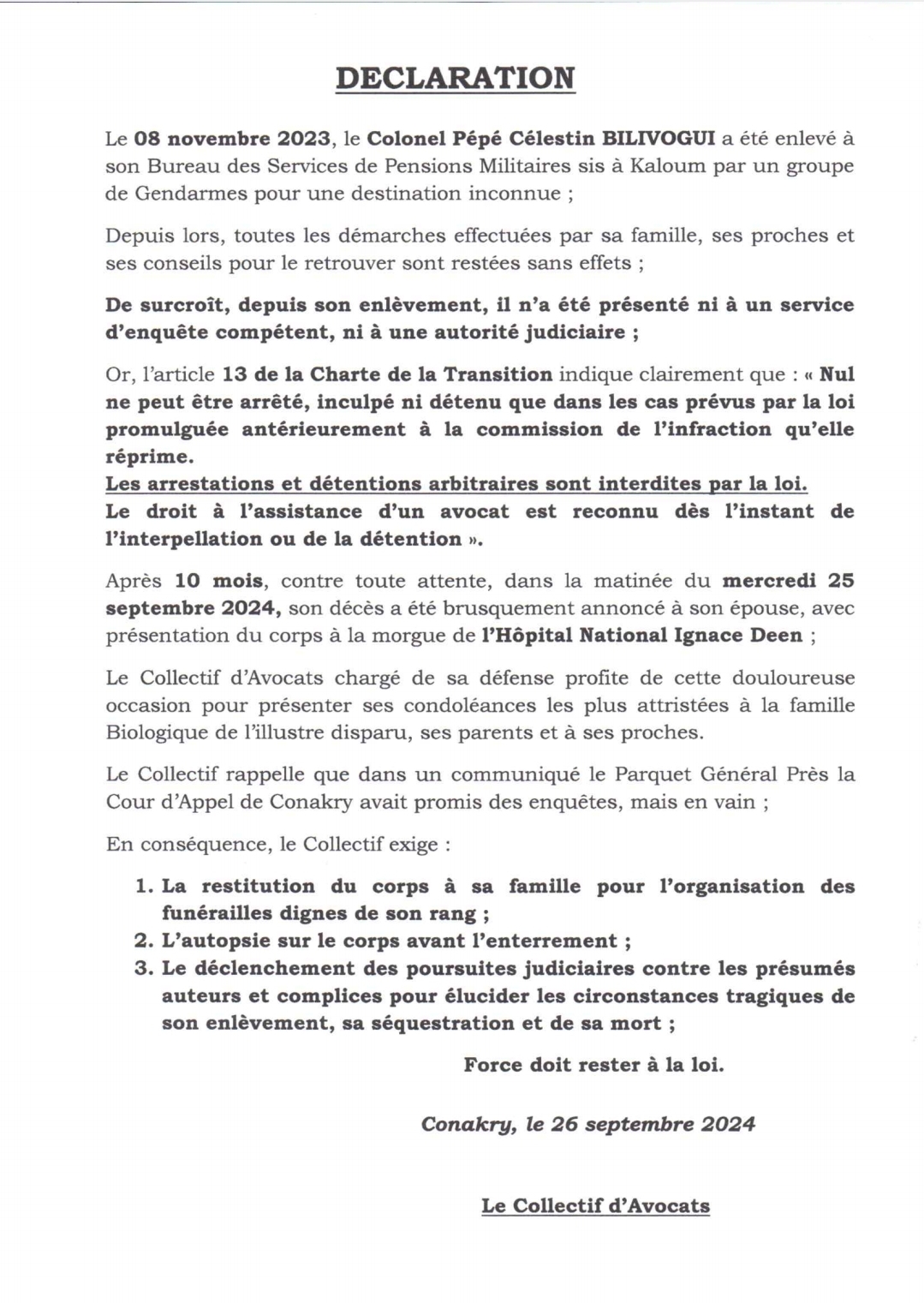 Le collectif d’avocats, exprimant sa consternation, exige des actions immédiates : « En conséquence, le collectif exige la restitution du corps à sa famille pour l’organisation des funérailles dignes de son rang ; l’autopsie sur le corps avant l’enterrement ; et le déclenchement des poursuites judiciaires contre les présumés auteurs et complices pour élucider les circonstances tragiques de son enlèvement, sa séquestration et de sa mort. Force doit rester à la loi. »