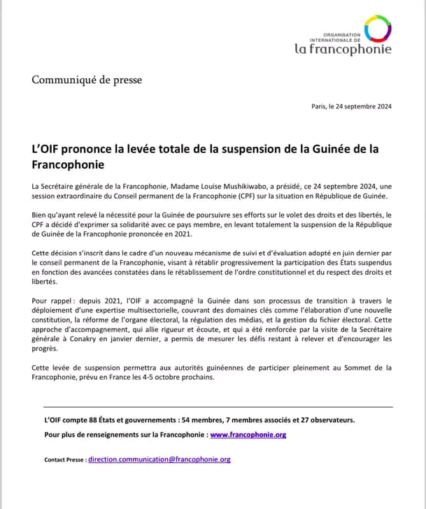 Trois ans après sa suspension suite au coup d’État de 2021, la Guinée a officiellement été réintégrée au sein de l’Organisation Internationale de la Francophonie (OIF). Cette décision, annoncée le 24 septembre 2024 lors d’une session extraordinaire du Conseil permanent de la Francophonie (CPF) à Paris, a été prise en dépit de certaines réserves concernant la situation des droits et libertés dans le pays.