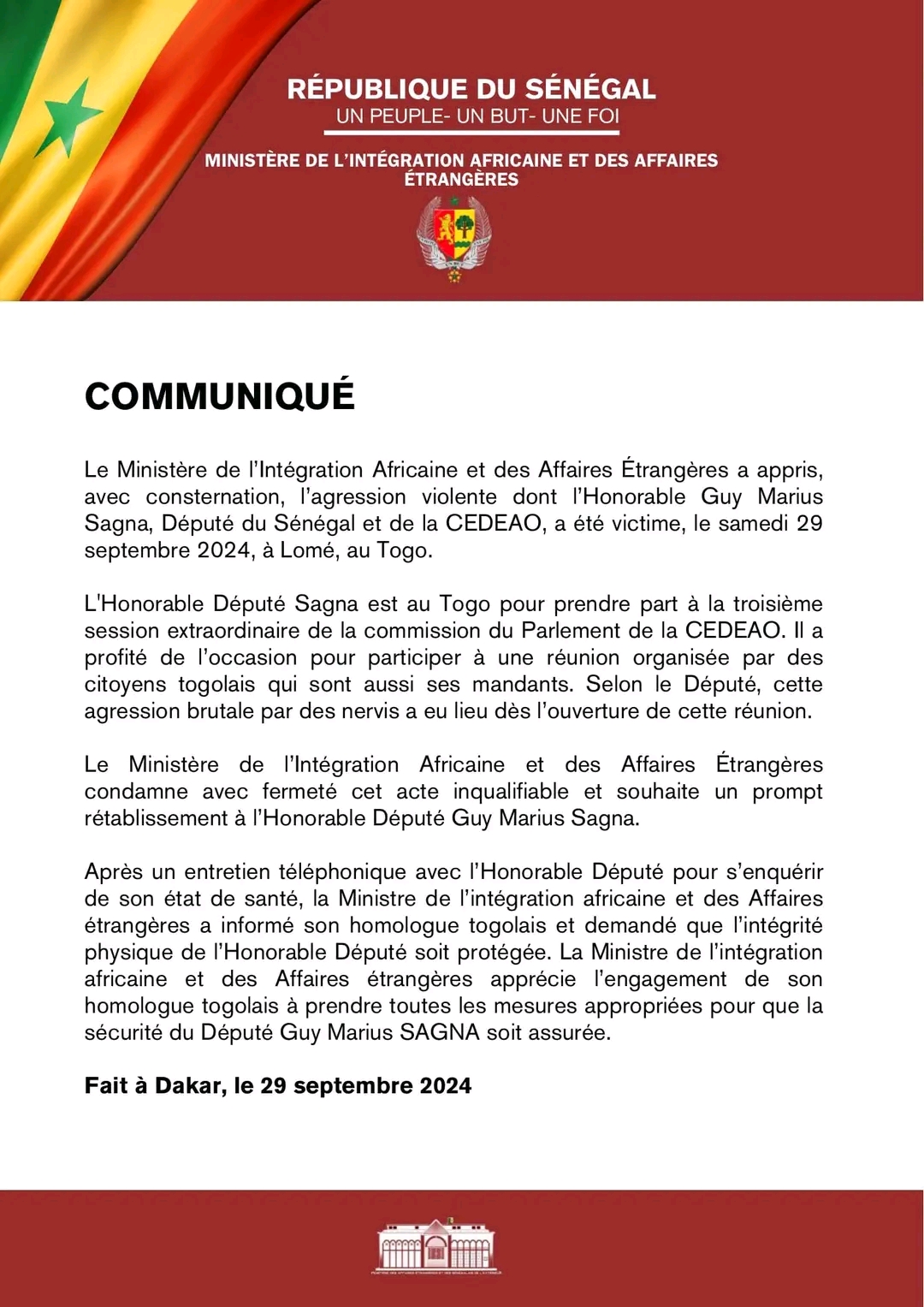 « Nous avons appris, avec consternation, l’agression violente dont l’Honorable Guy Marius Sagna a été victime», rapporte le linistère de l’Intégration africaine et des Affaires étrangères. Le député, en mission à Lomé pour participer à la troisième session extraordinaire de la commission du Parlement de la CEDEAO, a été agressé dès l’ouverture de la réunion qu’il avait prévue avec des citoyens togolais, qui sont aussi ses mandants.