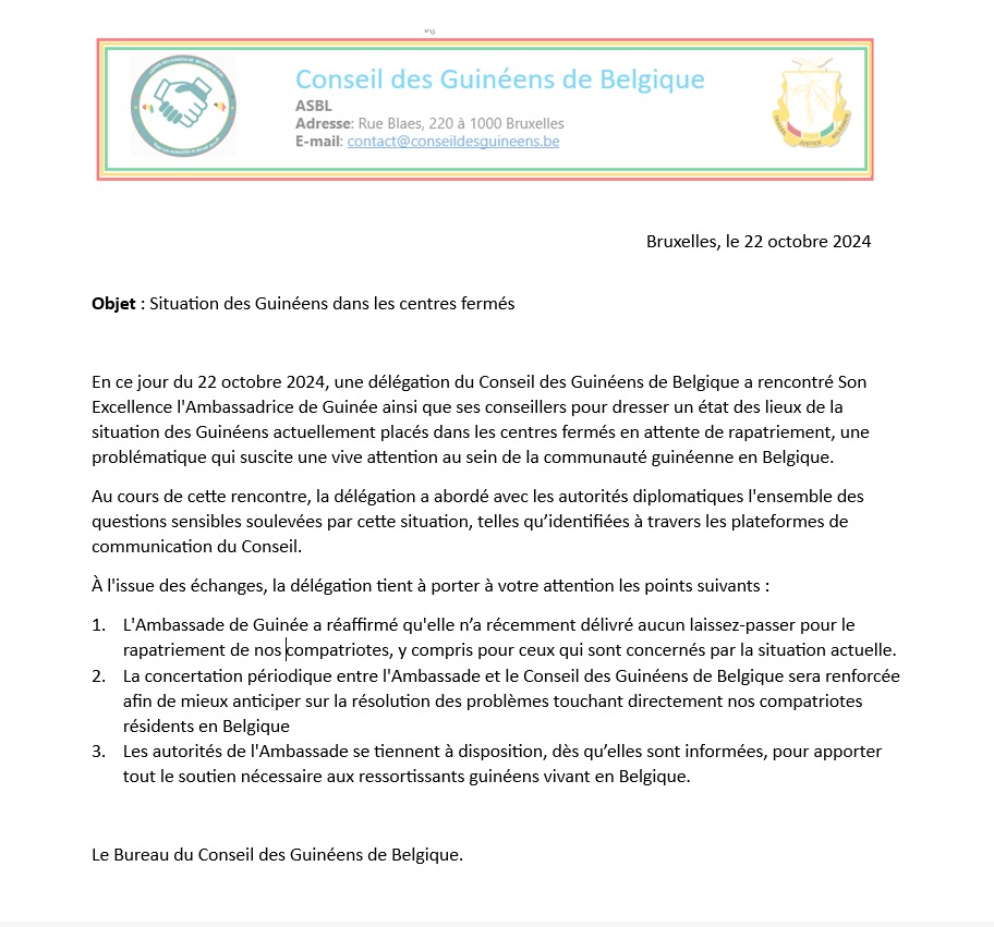 En date du 22 octobre 2024, une délégation du Conseil des Guinéens de Belgique a rencontré l’Ambassadrice de Guinée et ses conseillers pour discuter de la situation préoccupante des Guinéens placés dans des centres fermés en Belgique, en attente de rapatriement.