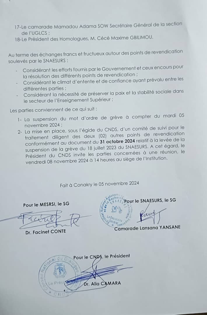 Pour assurer un suivi rigoureux des engagements pris, les parties ont convenu de la mise en place d’un comité de suivi. Ce comité, sous l’égide du CNDS, aura pour mission de traiter les deux derniers points de revendication en attente, conformément au document du 31 octobre 2024 lié à la levée de la suspension de la grève du 18 juillet 2023 du SNAESURS.
