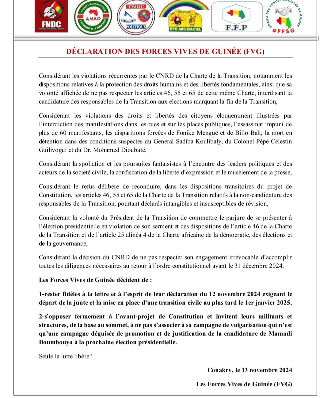 Face à cette situation, les Forces Vives de Guinée appellent à la mobilisation générale. Elles incitent leurs membres à refuser toute participation à la campagne de vulgarisation de la nouvelle Constitution, qu’elles qualifient de « campagne déguisée de promotion et de justification de la candidature de Mamadi Doumbouya ». Elles déclarent fermement : « Seule la lutte libère ! »