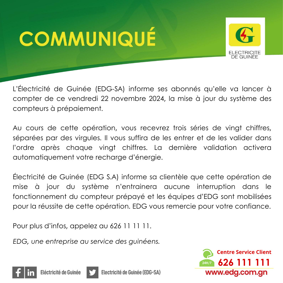 L’Électricité de Guinée (EDG S.A) informe ses abonnés qu’une mise à jour du système des compteurs à prépaiement sera lancée à partir de ce vendredi 22 novembre 2024. Cette opération vise à améliorer le fonctionnement des compteurs tout en garantissant une continuité dans la fourniture d’énergie.