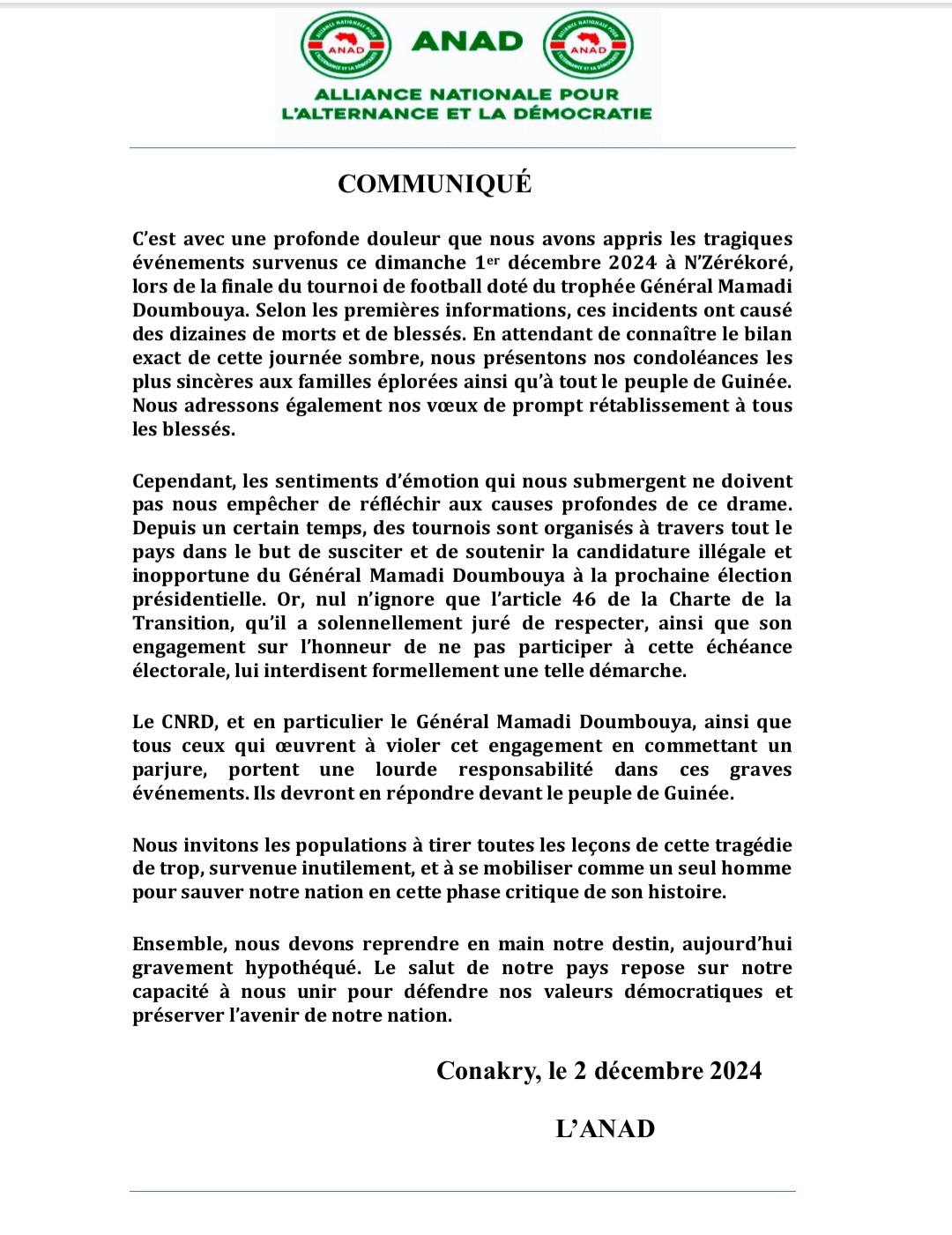 Suite aux tragiques événements survenus lors de la finale du tournoi doté du trophée Général Mamadi Doumbouya, l’Alliance Nationale pour l’Alternance et la Démocratie (ANAD) a publié un communiqué ce lundi 2 décembre 2024, exprimant sa profonde douleur et adressant ses condoléances aux familles des victimes.