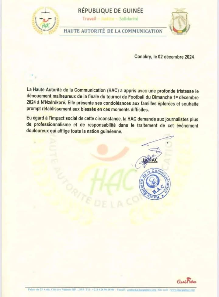 La Haute Autorité de la Communication (HAC) s’est exprimée ce lundi à travers un communiqué adressé à la rédaction, réagissant à la tragédie survenue le 1er décembre 2024 lors de la finale d’un tournoi de football à N’Zérékoré.