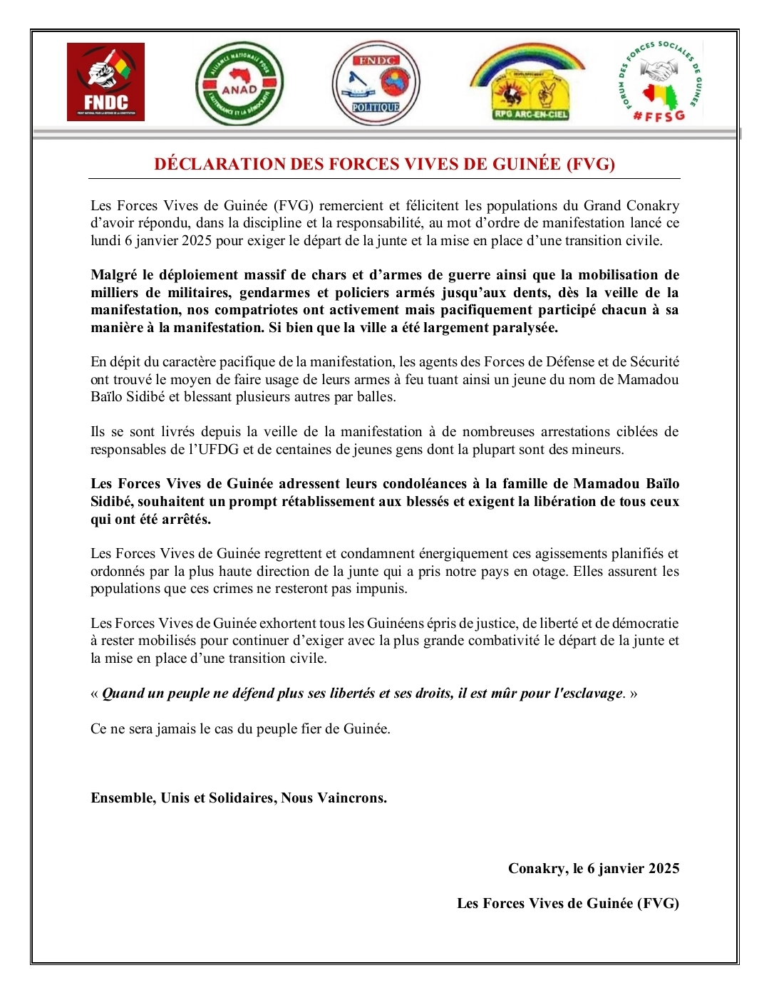 Les FVG ont adressé leurs condoléances à la famille de Mamadou Baïlo Sidibé et souhaité un prompt rétablissement aux blessés. Elles ont également exigé « la libération de tous ceux qui ont été arrêtés » tout en affirmant que « ces crimes ne resteront pas impunis. » Enfin, elles ont exhorté « tous les Guinéens épris de justice, de liberté et de démocratie à rester mobilisés pour continuer d’exiger avec la plus grande combativité le départ de la junte et la mise en place d’une transition civile. » Leur déclaration s’achève par ces mots : « Ensemble, Unis et Solidaires, Nous Vaincrons. »