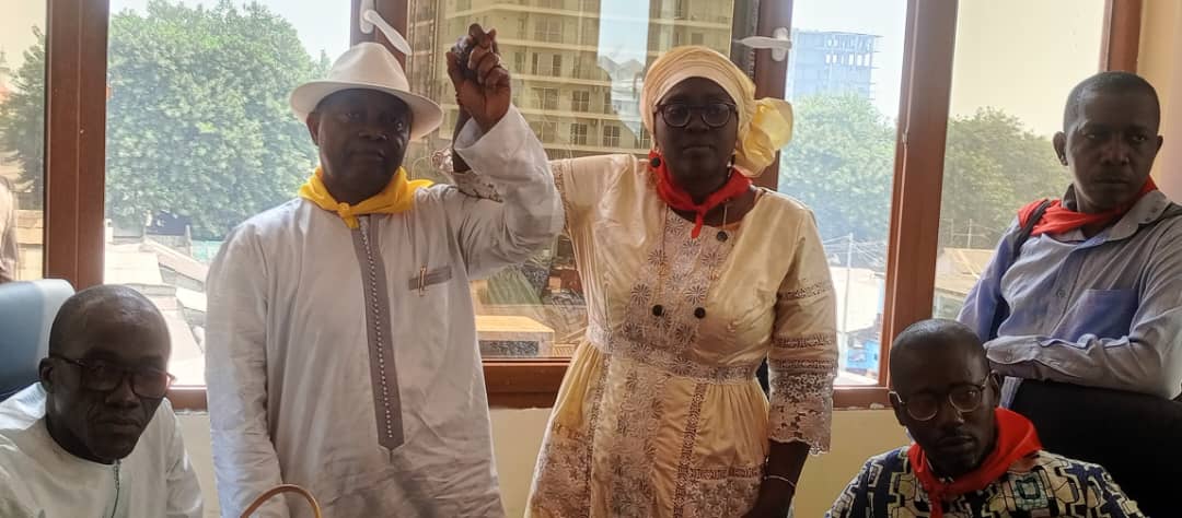 À l’occasion de l’inauguration du nouveau siège de l’USTG, ce vendredi 7 février 2025, l’unification du SLECG a été définitivement actée. Dame Kadiatou Bah et Aboubacar Soumah, ont accepté de fumer le calumet de la paix.