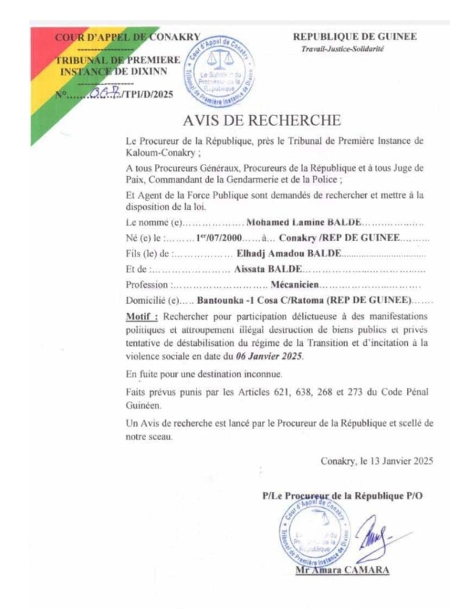 L’affaire prend une tournure décisive. Le procureur a donné des instructions fermes : retrouver Mohamed Lamine Baldé par tous les moyens. Selon libreopinionguinee.com,  ce militant, connu pour ses prises de position critiques envers le régime de Conakry, est visé par des accusations de malveillance qui, selon les autorités, nécessitent une comparution immédiate devant la justice.