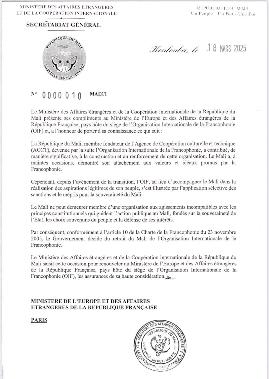 Dans une note diplomatique adressée au gouvernement français, pays hôte du siège de l’organisation, Bamako justifie sa décision par une profonde rupture de confiance avec l’OIF.