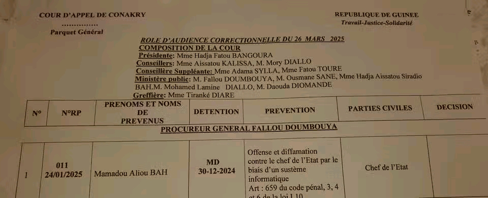 L’audience en appel d’Aliou Bah, poursuivi pour offense et diffamation contre le général Mamadi Doumbouya, s’est ouverte ce mercredi 26 mars 2025 à la Cour d’appel de Conakry. Dès l’entame des débats, la défense a soulevé un point essentiel : la constitution de partie civile du chef de l’État, un élément qui, selon elle, relève de l’intimidation judiciaire.