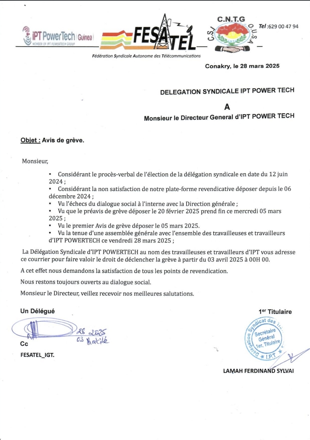 IPT Powertech, principal fournisseur d’énergie d’Orange Guinée, a déposé un préavis de grève, menaçant d’arrêter le travail à partir du 3 avril 2025 à minuit.
