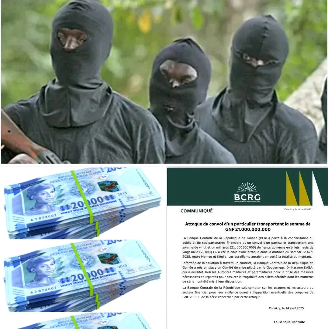 Un convoi privé transportant 21 milliards de francs guinéens en billets neufs de 20 000 GNF a été attaqué le samedi 12 avril 2025, entre Mamou et Kindia, a annoncé la Banque Centrale de la République de Guinée (BCRG) ce 14 avril.
