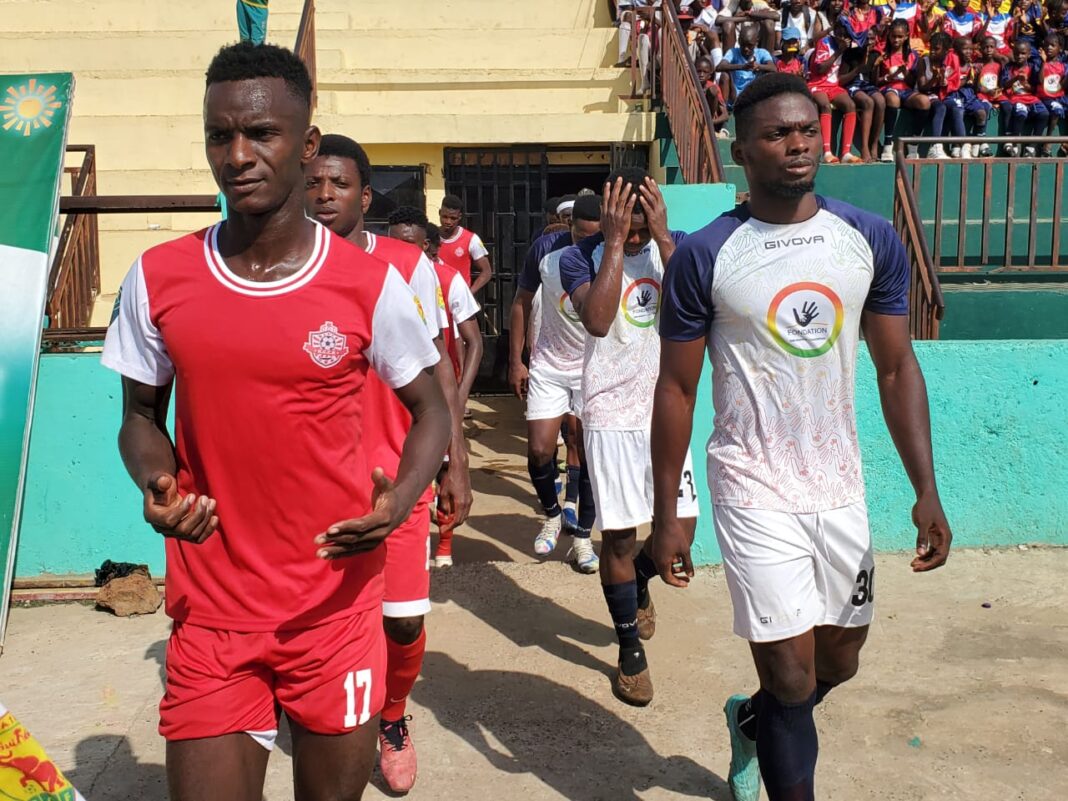 Entre panique défensive et une multitude d’assauts offensifs du club de plie la Guinée Foot Élite avant de rejoindre les vestiaires grâce à un magnifique coupé de trajectoire de Ibrahima Camara qui inscrit le deuxième but à la 45eme minute. Score 1-2 à la mi-temps.