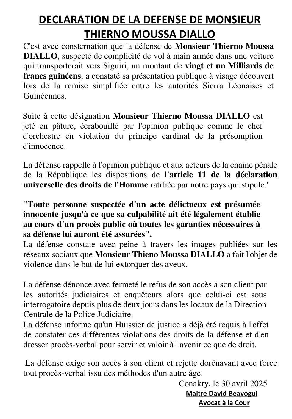 À la suite de l’interpellation et l’extradition de Thierno Moussa Diallo, principal suspect du braquage entre Kindia et Mamou, où 21 milliards GNF ont été dérobés, son avocat est monté au créneau pour dénoncer le violation de la présomption d’innocence de son client.