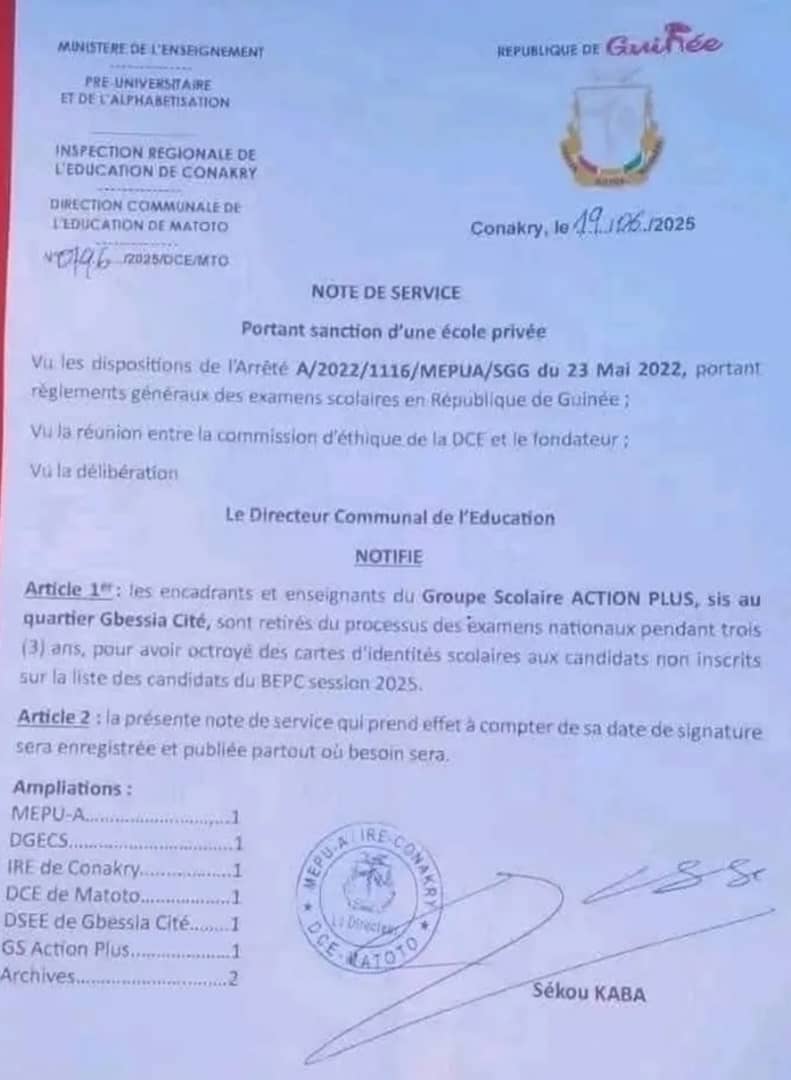 Le Groupe Scolaire ACTION PLUS, situé à Gbessia Cité, vient d’être sévèrement sanctionné par la Direction Communale de l’Éducation pour son implication dans une fraude aux examens nationaux. Des enseignants et encadrants de l’établissement sont exclus du processus des examens pendant trois ans, pour l’octroi illégal de cartes d’identité scolaire à des candidats non inscrits sur la liste officielle du BEPC, session 2025, rapporte Laguinee.info à travers un de ses journalistes.