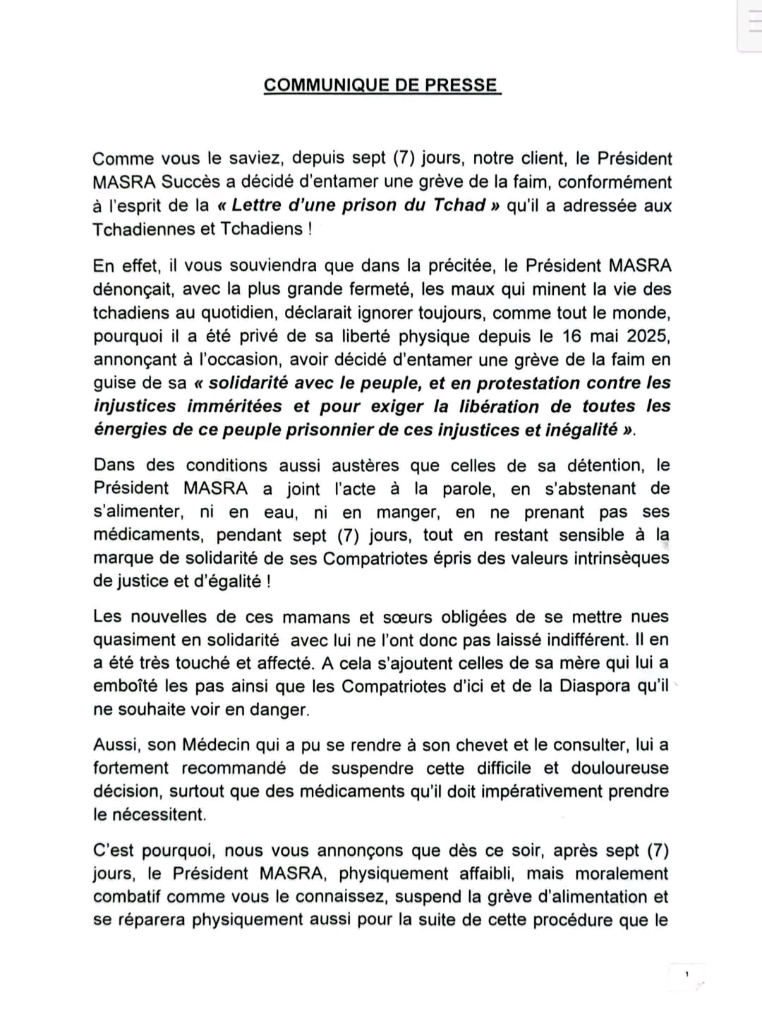 L’opposant tchadien Succès Masra, incarcéré depuis le 16 mai dernier, a mis un terme à la grève de la faim qu’il observait depuis une semaine. L’annonce a été faite lundi 30 juin au soir par son collectif d’avocats, qui évoque un homme « physiquement affaibli mais moralement combatif ». Dans un communiqué, ses conseils précisent que l’ancien Premier ministre « suspend sa grève d’alimentation et se repréparera pour la suite de cette procédure ». Son médecin personnel, récemment autorisé à le visiter, aurait insisté sur l’impératif d’une reprise alimentaire, indispensable à l’administration de traitements médicaux.