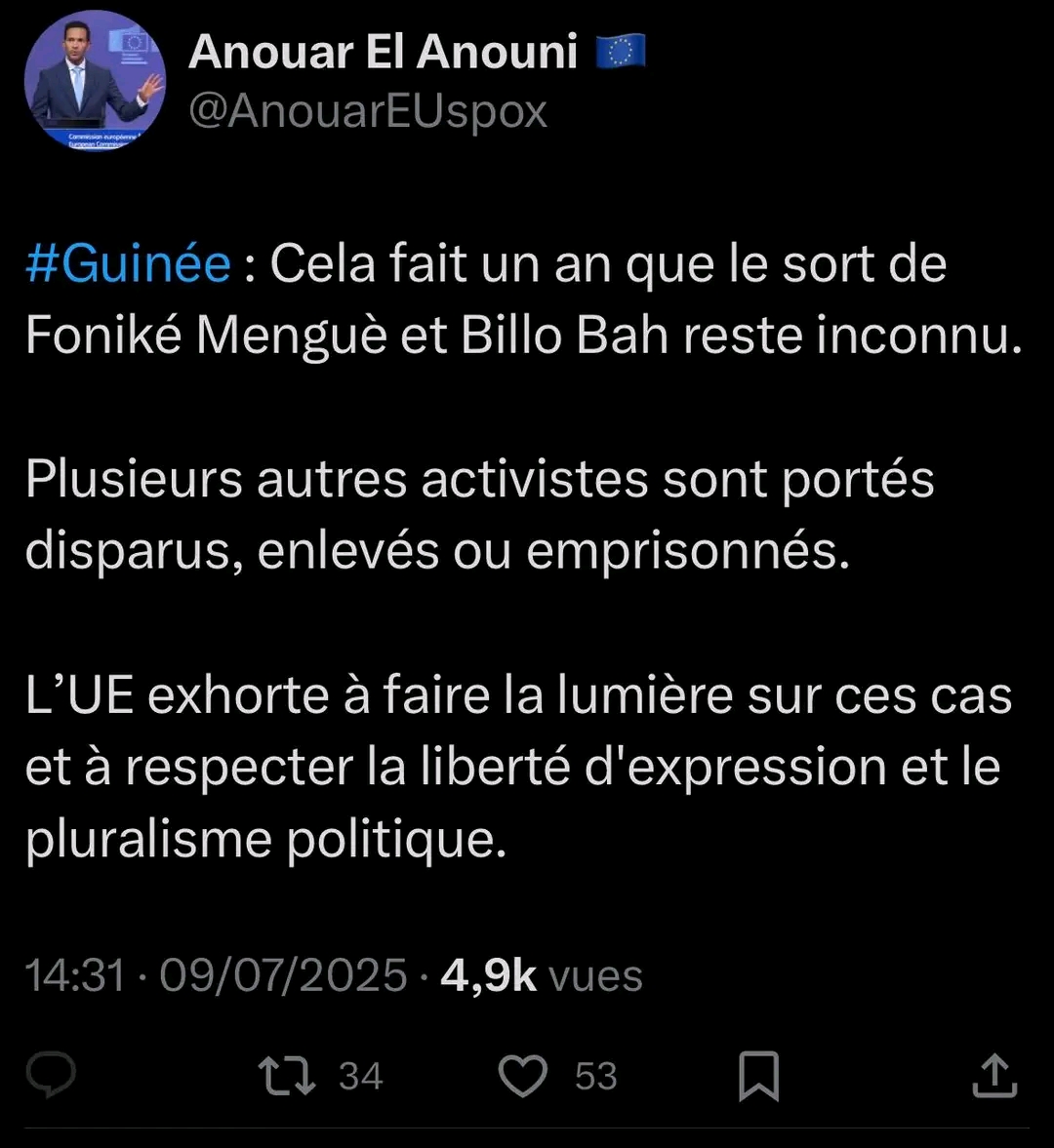 Par la voix de son représentant Anouar Elnouani, l’Union européenne (UE) a une nouvelle fois exprimé son inquiétude face au silence persistant autour du sort de deux figures de la société civile guinéenne : Oumar Sylla, alias Foniké Mengué, et Mamadou Billo Bah. Disparus depuis exactement un an, les deux hommes demeurent introuvables, sans que les autorités n’apportent d’éclaircissements sur leur situation.