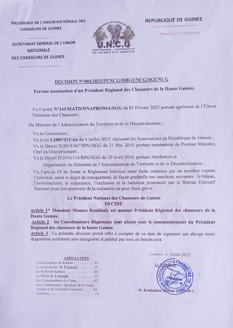 Dans une autre décision signée par le président Camara, Moussa Koulibaly a été désigné président régional des chasseurs de la Haute-Guinée, renforçant ainsi l’ancrage local de la coordination des Donzos dans cette région stratégique du pays.