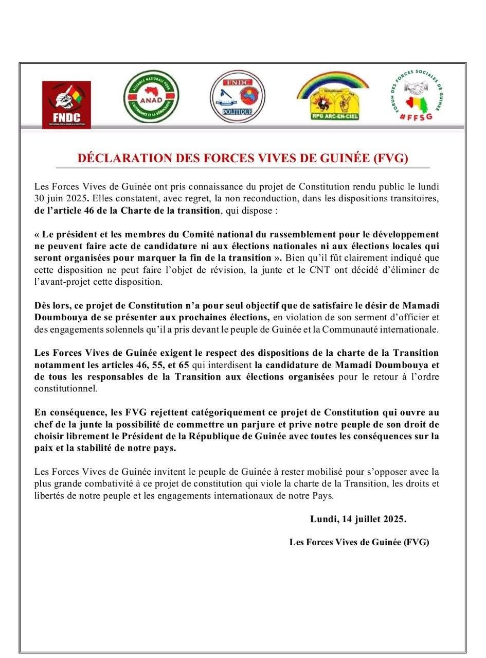 Se connecter Bienvenue ! Connectez-vous à votre compte : votre nom d'utilisateur votre mot de passe Forgot your password? Get help Récupération de mot de passe Récupérer votre mot de passe votre email Un mot de passe vous sera envoyé par email. Actualité Projet de Constitution : Les FVG dénoncent » la non reconduction de l’article 46 de la charte de la transition » Publié par laguinee.info 14 juillet 2025 Share FacebookTwitterPinterestWhatsAppLinkedinEmailPrintViber À LIRE AUSSI Desserte en courant électrique : le Général Mamadi Doumbouya tape du poing sur la table ! (Confidences) 4 juillet 2024 Filets fatigués, poissons rares: les pêcheurs de Koba dans l’impasse ! 20 avril 2024 Koba: immersion dans l’univers des producteurs artisanaux du sel 19 avril 2024 Le gombo, le trésor vert de la sous-préfecture de Koba ! 18 avril 2024 laguinee.infohttps://laguinee.info Share FacebookTwitterPinterestWhatsAppLinkedinEmailPrintViber Article précédentAccusations contre Ousmane Doumbouya: « La seule vérité dans les récits, c’est la volonté de nuire à l’homme »Article suivantMédias et Intelligence Artificielle : le Colloque international de Cotonou fait des recommandations - Advertisement - ECHO DE NOS RÉGIONS Retour de mission mouvementé : frayeur pour Elhadj Fodé Madjaye Magassouba après un accident à Tapiyoka 23 février 2026 Kindia : un incendie ravage plusieurs hectares d’ananas, un exploitant agricole lance un appel à l’aide 22 février 2026 N’Zérékoré : une famille dévastée par un incendie en pleine saison sèche appel au secours 20 février 2026 « Quand je suis arrivé, j’ai entendu des femmes pleurer… il était dans un état vraiment critique » : témoignage sur la mort d’un... 19 février 2026 Kissidougou : le sac de ciment atteint 120 000 GNF dans les magasins 19 février 2026