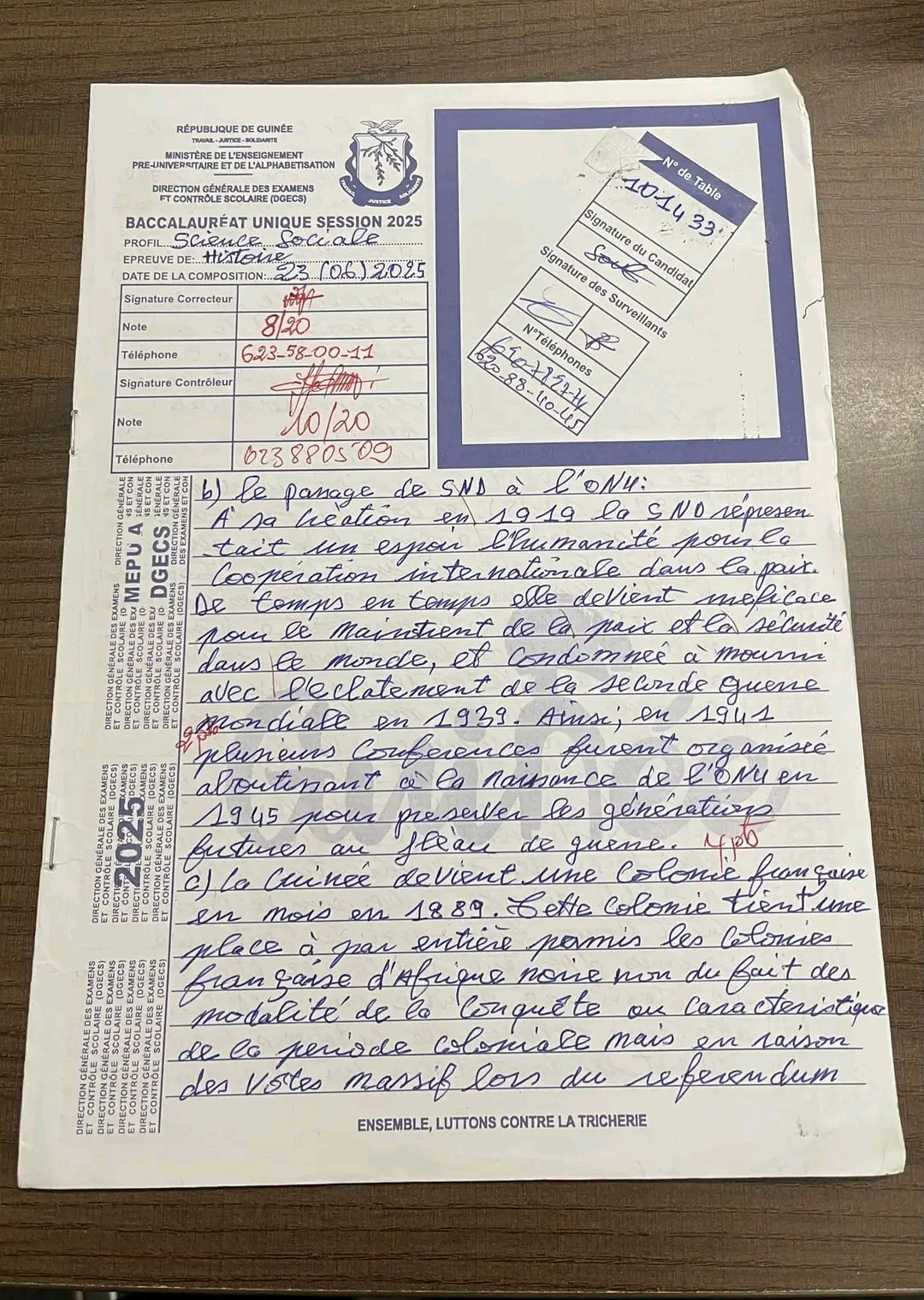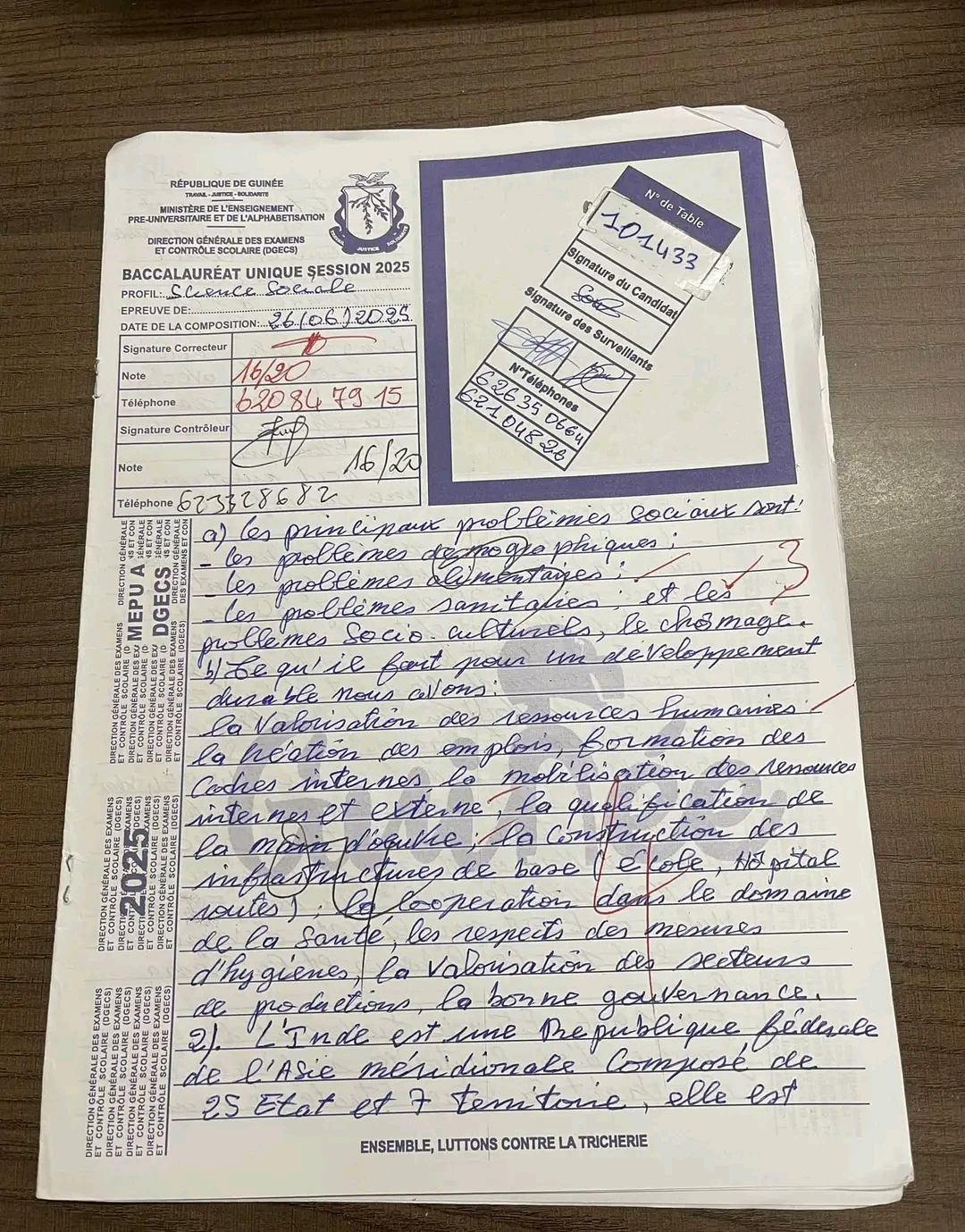 Face à la montée de cette polémique, la Direction Générale des Examens et Contrôle Scolaires (DGECS) a réagi à travers une communication officielle. Après avoir analysé les éléments fournis par le candidat et les données diffusées sur les réseaux sociaux, les services compétents déclarent avoir identifié le centre, l’école d’origine ainsi que le profil complet de l’élève, en s’appuyant sur les matières citées et l’écriture visible sur les copies.