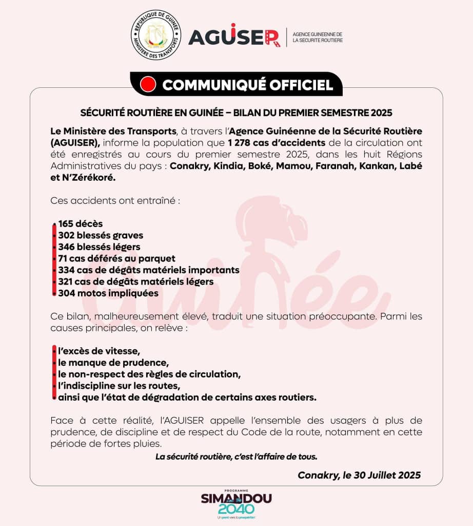 Face à cette hécatombe silencieuse, l’AGUISER lance un appel à la mobilisation générale. L’Agence exhorte les conducteurs à plus de prudence, les autorités locales à renforcer le contrôle routier, et les citoyens à adopter une culture de sécurité au volant. Car derrière chaque chiffre, il y a des familles endeuillées, des vies brisées, et une société qui paie un prix trop fort.