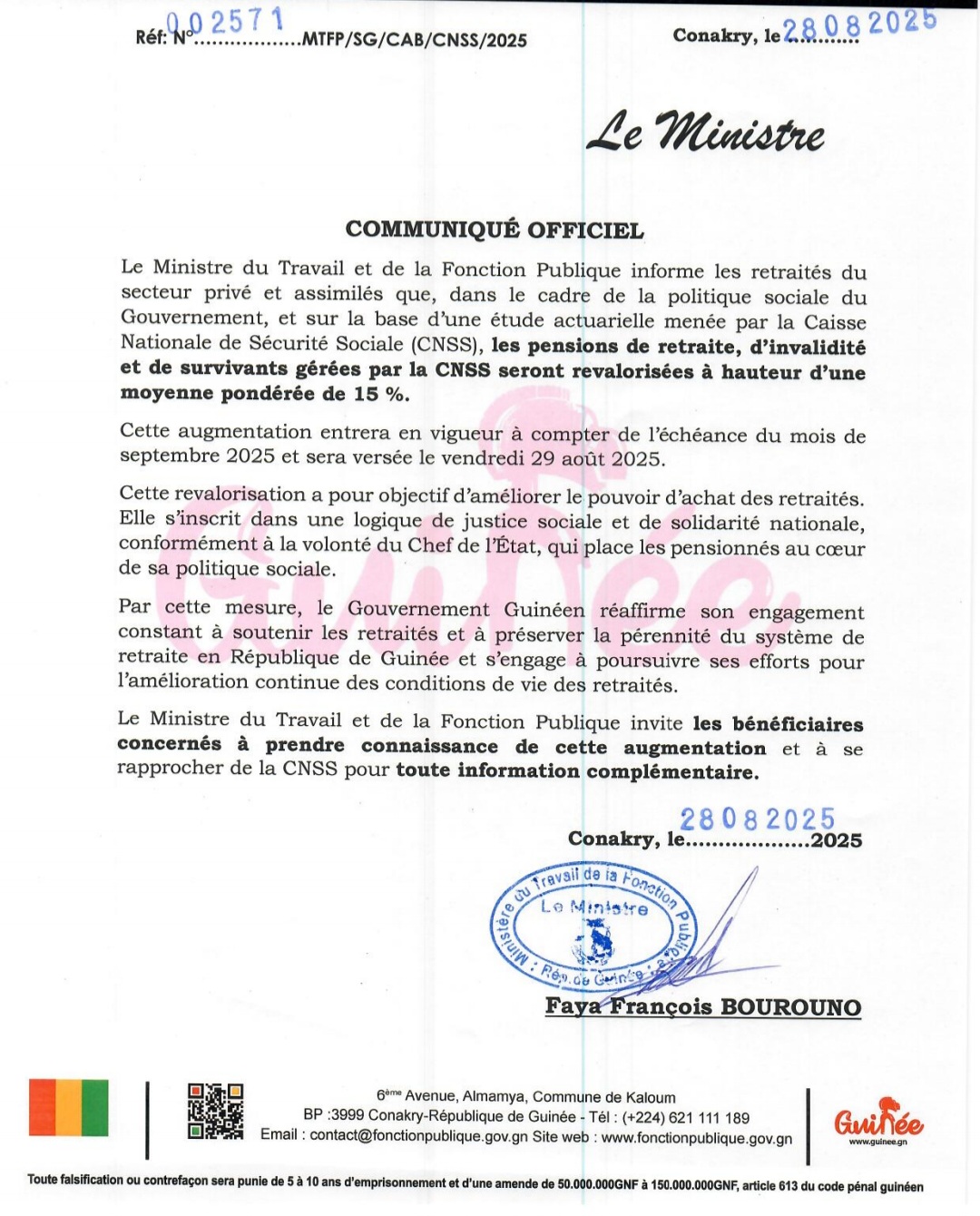 Le Gouvernement guinéen a annoncé ce jeudi une revalorisation des pensions de retraite, d’invalidité et de survivants versées par la Caisse Nationale de Sécurité Sociale (CNSS). Cette mesure, décidée dans le cadre de la politique sociale nationale, prévoit une augmentation moyenne de 15 %, applicable à compter de l’échéance du mois de septembre 2025.