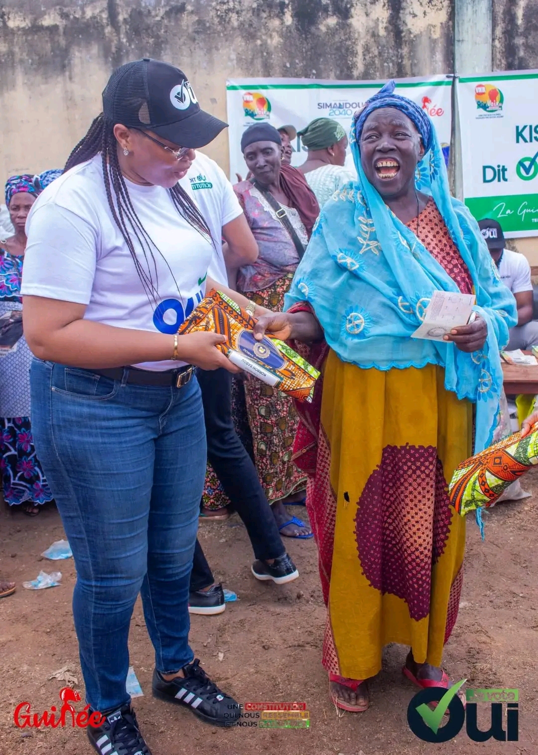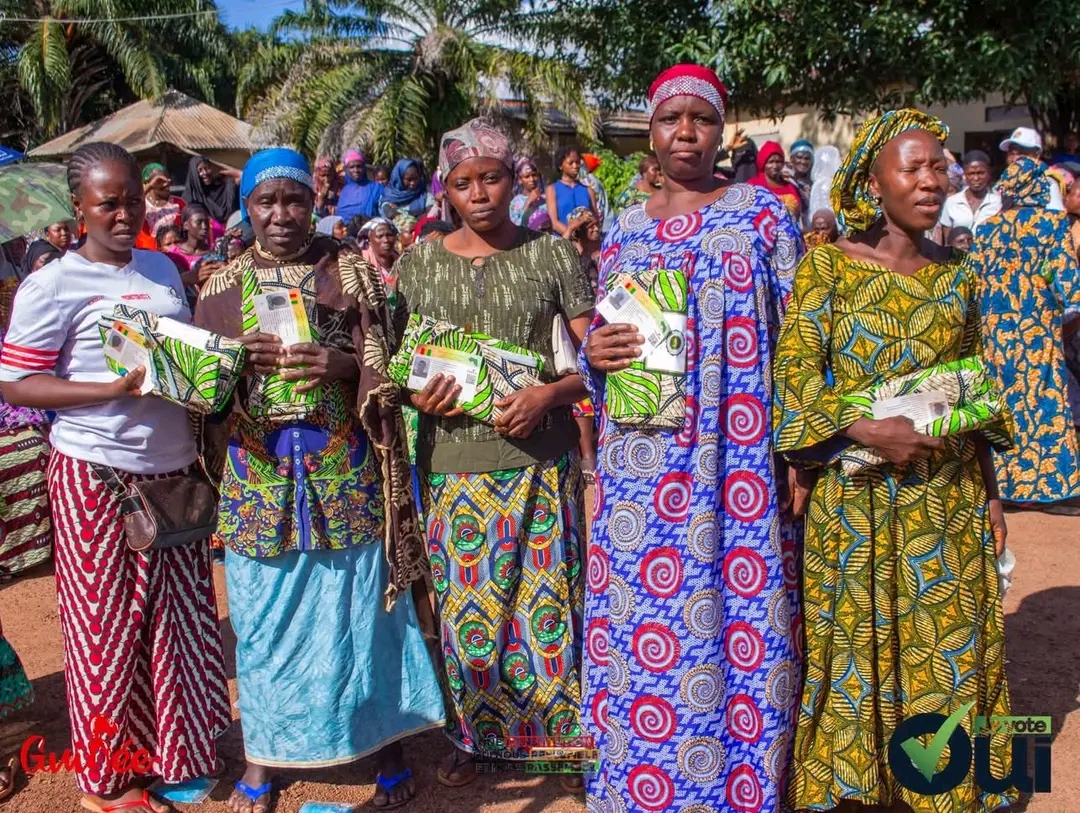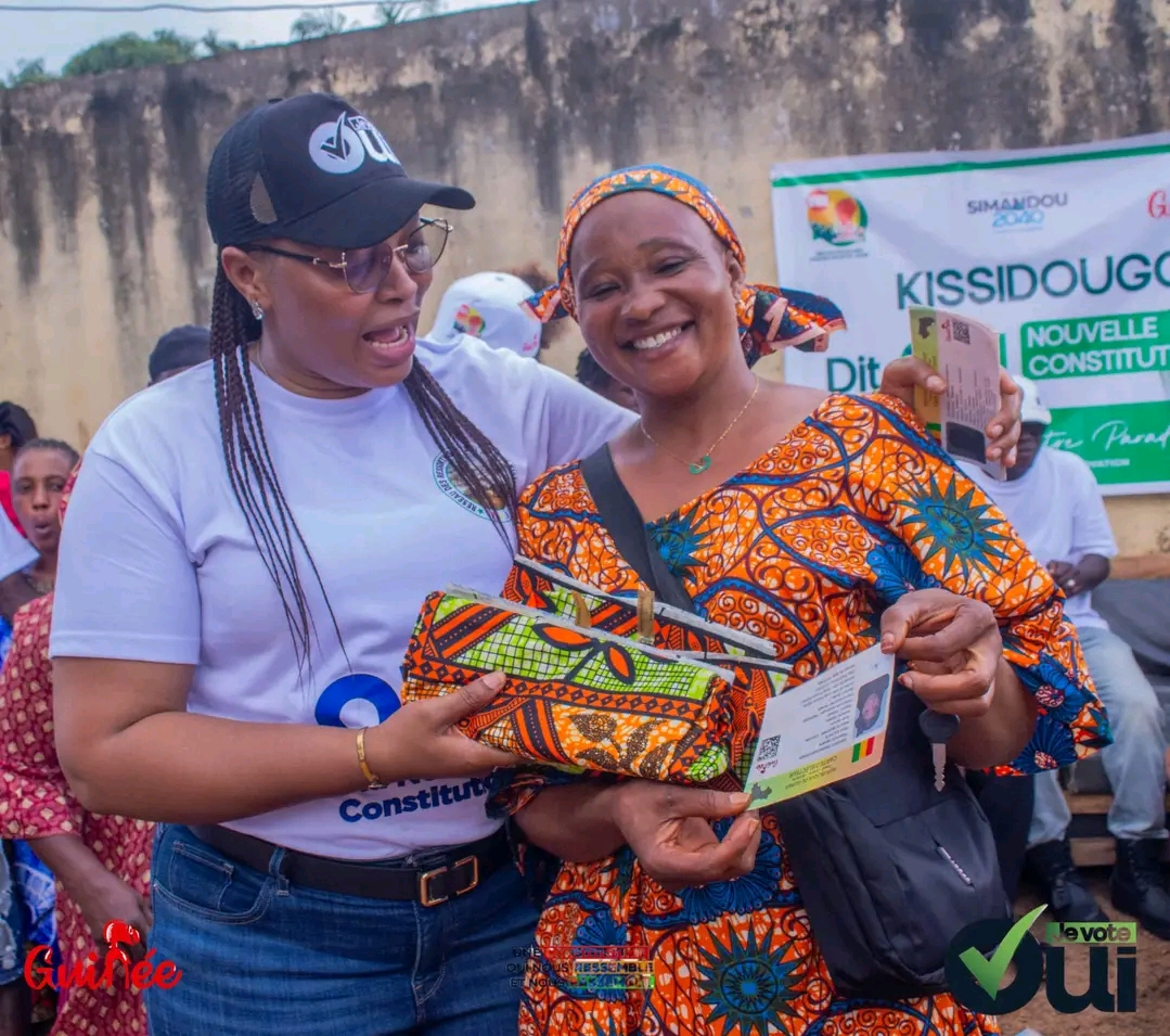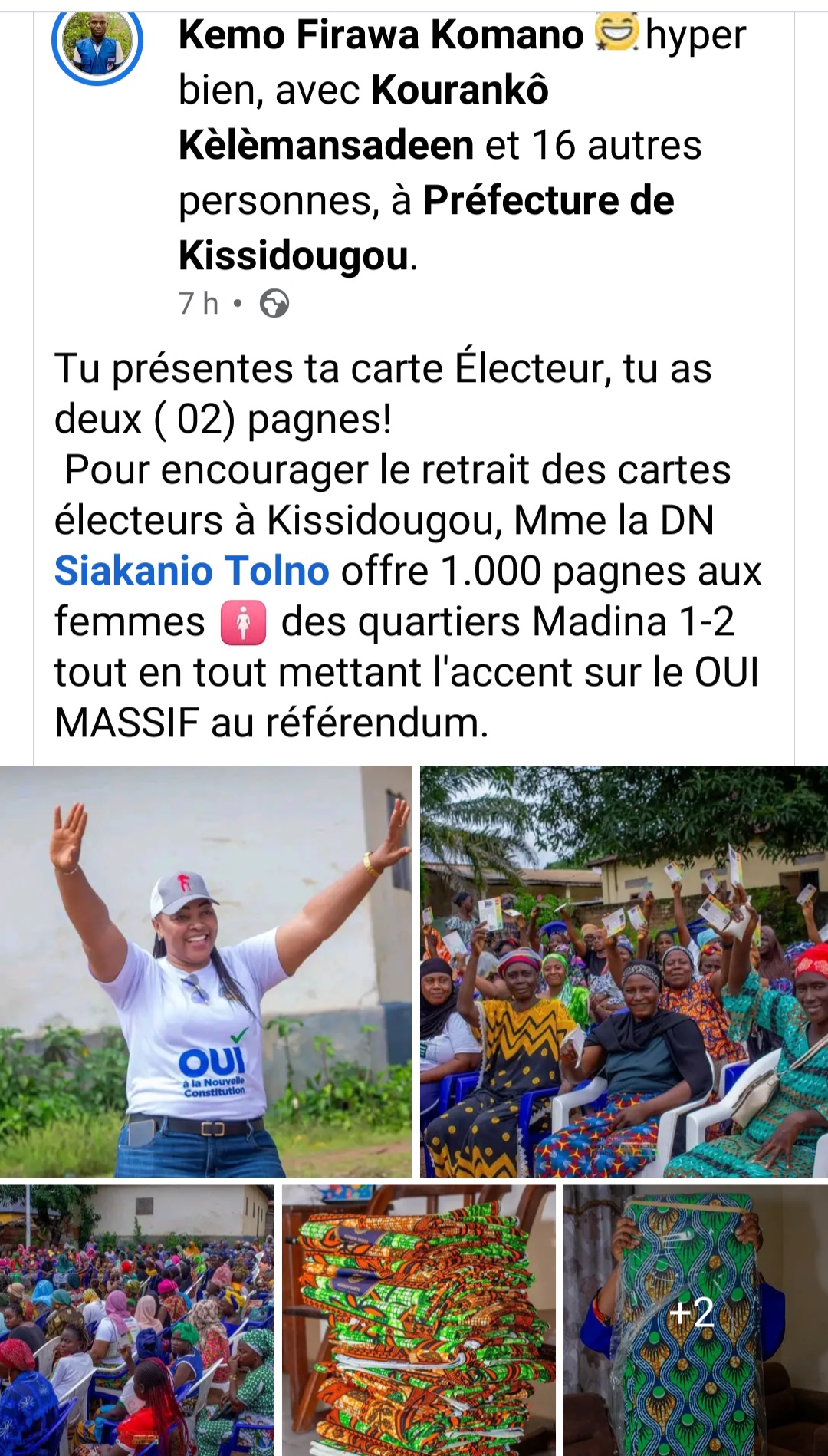 À Kissidougou, la campagne référendaire en faveur du projet de nouvelle Constitution a été marquée par un événement qui ne laisse personne indifférent. La Directrice nationale des Petites et Moyennes Entreprises, Mme Sia Kanio Tolno, a offert 1000 pagnes aux femmes des quartiers Madina 1 et 2. Pour bénéficier de ce geste, il fallait présenter sa carte d’électeur, et surtout, répondre à l’appel d’un « Oui massif » lors du scrutin selon les publications faites sur les réseaux sociaux dont nous avons fait capture.