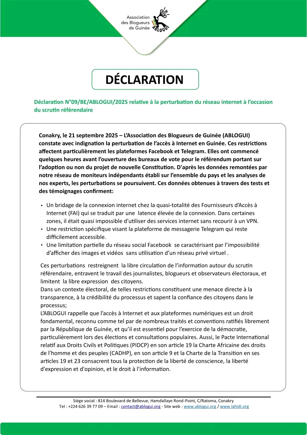 L’ABLOGUI estime que l’accès à Internet est un outil indispensable pour le suivi citoyen, la diffusion d’informations et la participation démocratique. « Restreindre cet accès en plein scrutin, c’est fragiliser la confiance dans le processus électoral », souligne l’association.
