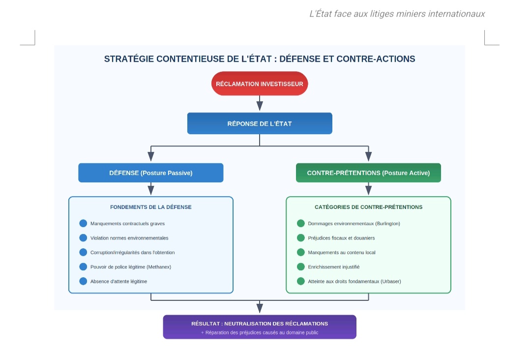 La stratégie guinéenne doit ainsi reposer sur une articulation méthodique entre défense et attaque. La défense consiste à démontrer que la mesure litigieuse est pleinement légale, nécessaire à la protection du domaine public et conforme aux normes internationales. L’attaque consiste à engager la responsabilité de l’investisseur pour ses propres violations, à solliciter des dommages-intérêts proportionnés et à transformer le contentieux arbitral en levier de régulation économique. Cette double capacité, caractéristique des États exerçant une souveraineté mature, permet de neutraliser les risques financiers tout en renforçant la crédibilité institutionnelle du pays dans l’espace minier international.