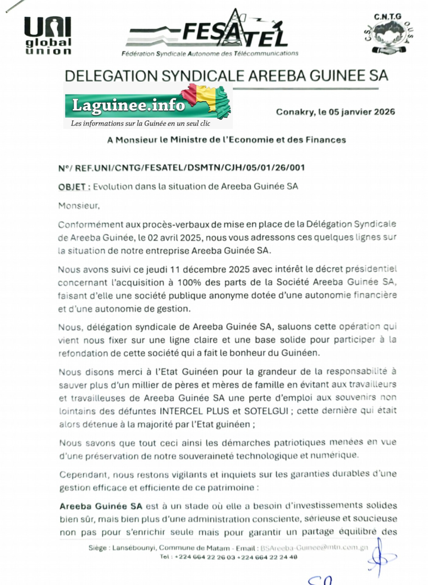 La délégation syndicale d’Areeba Guinée SA sort de son silence et adresse un message direct au ministre de l’Économie et des Finances. Dans une lettre datée du 5 janvier 2026 dont Laguinee.info dispose copie, les représentants des travailleurs saluent l’acquisition à 100 % de l’opérateur télécom par l’État, tout en exprimant de fortes inquiétudes quant à la gestion future de l’entreprise.