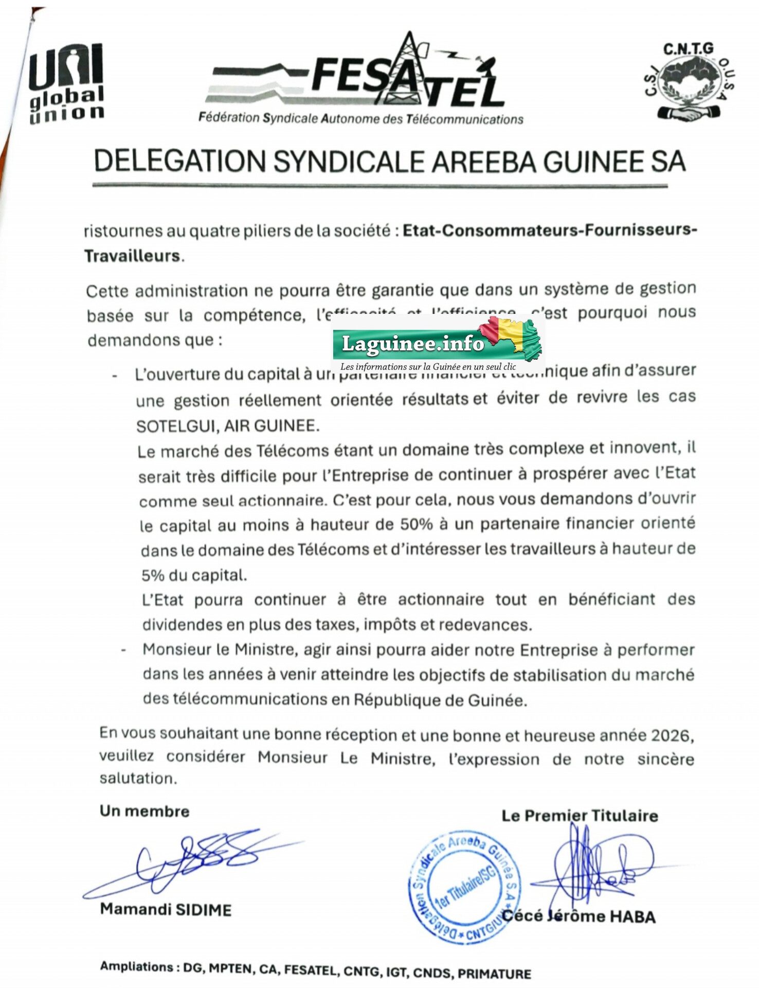 La lettre se conclut par des salutations respectueuses, mais elle laisse transparaître une demande urgente : des garanties claires, une stratégie solide et une gouvernance partagée pour assurer l’avenir d’Areeba Guinée SA.
