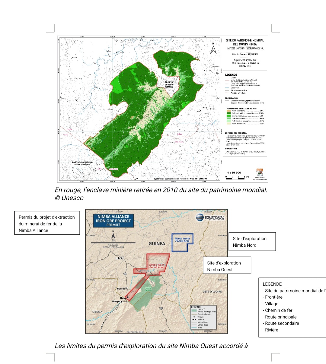 La société australienne Equatorial Resources Limited (ERL) a acquis le permis d’exploration de la Nimba Alliance pour les sites appelés Nimba Nord (10 700 hectares) et Nimba Ouest (19 800 hectares). Ce dernier se trouve en partie sur le site du patrimoine mondial, le reste dans la zone tampon. En 2025, le Comité du patrimoine mondial de l’UNESCO a exprimé « sa vive inquiétude quant au fait que le permis Nimba Ouest racheté par ERL englobe une partie importante de la composante guinéenne du bien ».