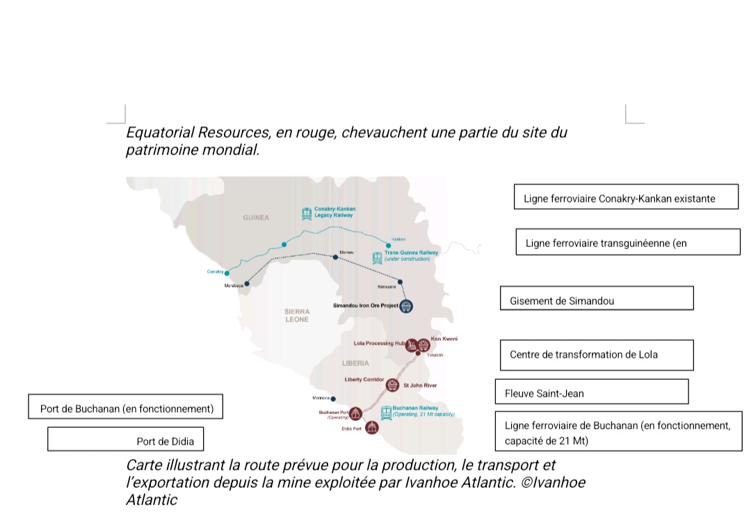 Ivanhoe Atlantic, société privée états-unienne, a reçu avec d’autres entreprises l’autorisation de mener des activités d’exploration et d’exploitation du minerai de fer sur le mont Nimba. Des permis attribués après des années de délai et le coup d’état militaire du Comité national du rassemblement pour le développement (CNRD), qui a renversé le président Alpha Condé en septembre 2021, dans un contexte de crise de régime marquée par de graves atteintes aux droits humains. La concession couvre une superficie de 1 550 hectares (une concession minière de 625 hectares et un périmètre minier de 925 hectares), retirée par un décret de 2010 du cœur du site du patrimoine mondial.