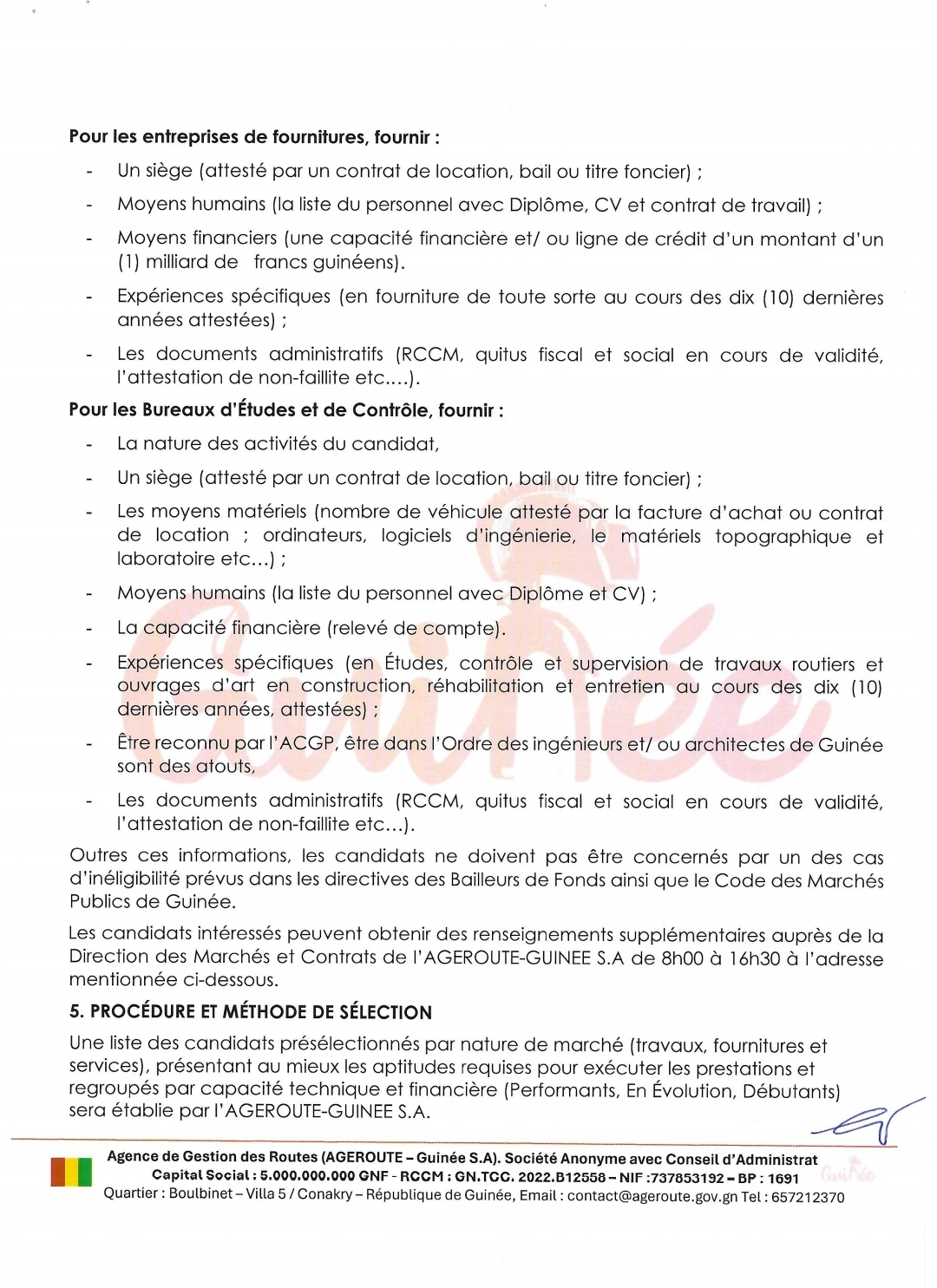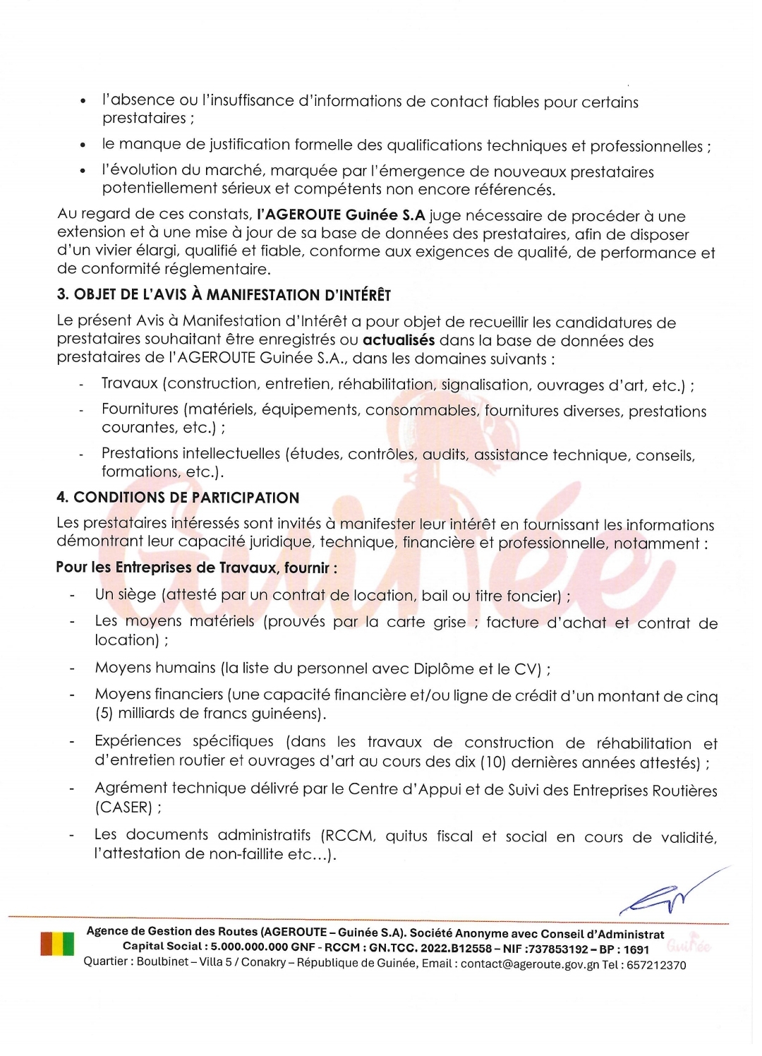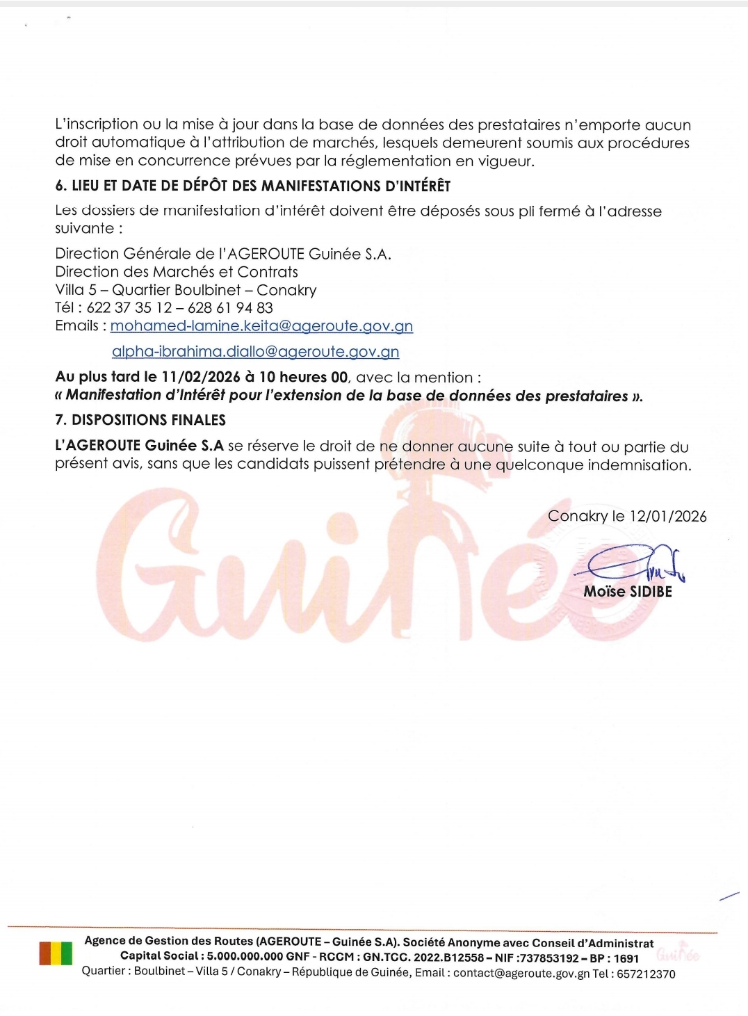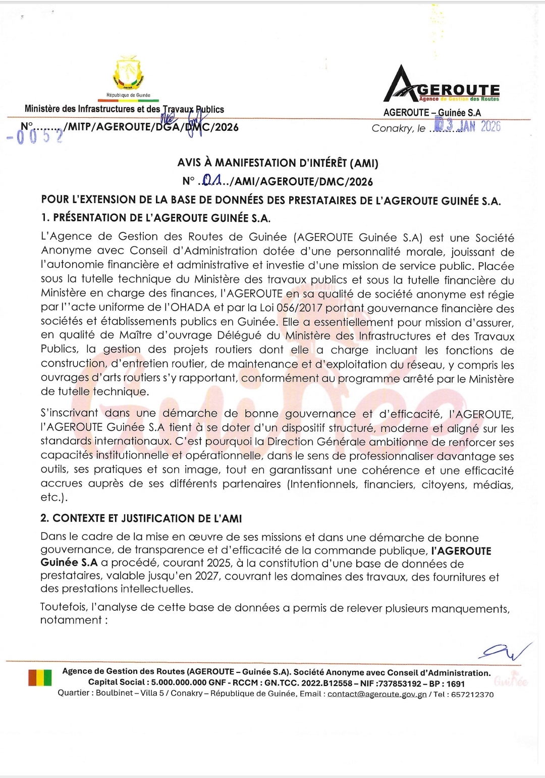 Gestion des routes: l’AGEROUTE Guinée lance un appel à manifestation d’intérêt pour l’extension de sa base de données prestataires