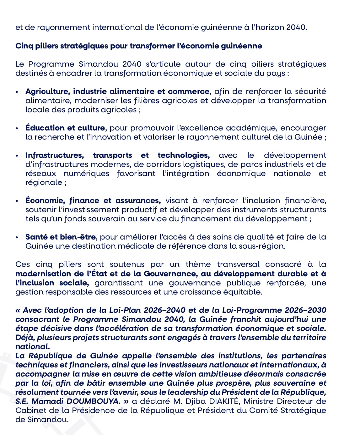 Selon les autorités, le programme Simandou 2040 doit désormais servir de cadre de référence pour l’action publique, en orientant les politiques économiques et les investissements vers une transformation structurelle de l’économie.