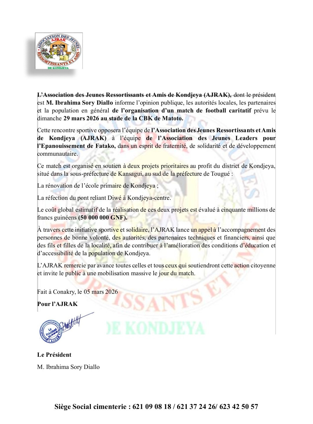 L’Association des Jeunes Ressortissants et Amis de Kondjeya (AJRAK), présidée par Ibrahima Sory Diallo, organise un match de football caritatif le dimanche 29 mars 2026 au stade de la CBK de Matoto. Cette rencontre sportive, qui opposera l’AJRAK à l’Association des Jeunes Leaders pour l’Épanouissement de Fatako, vise à mobiliser des fonds pour la rénovation de l’école primaire de Kondjeya et la réfection du pont reliant Diwé à Kondjeya-centre, deux projets estimés à 50 millions de francs guinéens.