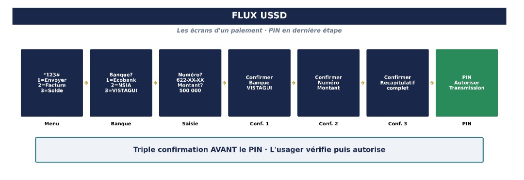 L’usager compose *123# depuis son téléphone, sélectionne l’opération souhaitée, choisit la banque du bénéficiaire dans le menu guidé, entre son numéro de téléphone et le montant. Le système présente alors trois écrans de confirmation successifs: la banque du destinataire, le numéro et le montant, puis le récapitulatif complet. L’usager peut annuler à chaque étape sans conséquence. Cette triple confirmation est un verrou délibéré: le canal USSD étant irréversible, chaque étape porte sur un élément distinct pour que l’usager vérifie ce qu’il fait, pas seulement qu’il confirme qu’il veut le faire. Le menu guidé ne proposant que des banques participantes au système, l’erreur de sélection est structurellement réduite. Après vérification, l’usager saisit son PIN pour autoriser la transmission. Ce code confidentiel authentifie l’usager comme titulaire du compte – l’opérateur ne le voit pas. C’est cet acte qui déclenche la transmission de l’ordre de paiement au réseau GSM de l’opérateur.