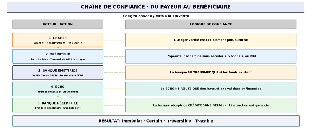 La chaîne de confiance est donc la suivante: la banque émettrice ne transmet que si les fonds existent, la BCRG n’achemine que des instructions validées et financées, et la banque réceptrice crédite sans délai parce qu’elle sait que l’instruction qui lui parvient est garantie. C’est à la BCRG de garantir la fiabilité du système de routage et de règlement. C’est aux accords interbancaires de fixer les règles de confiance réciproque entre établissements. Et c’est à l’instruction BCRG de rendre ces engagements obligatoires. Lorsque ces conditions sont réunies, l’usager n’a pas besoin d’être convaincu: il envoie de l’argent, le bénéficiaire le reçoit en quelques secondes, et la transaction laisse une trace que le cash ne fournit que dans les conditions où les parties prennent le temps de documenter leurs transactions. L’adoption suit naturellement, parce que le service est objectivement meilleur que l’alternative. La confiance se construit au niveau institutionnel et produit un effet d’entraînement chez les usagers.