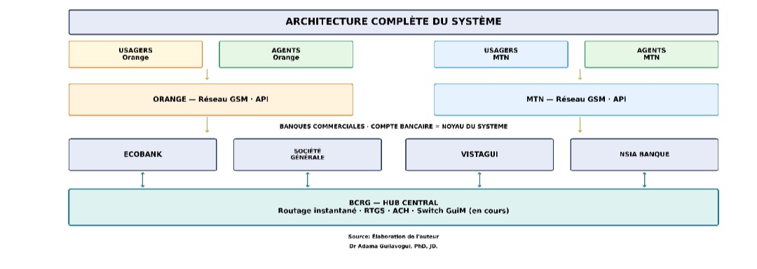 Vu l’intérêt suscité par cette première publication, la présente tribune en développe le volet opérationnel: comment, concrètement, cette réforme peut-elle être architecturée et déployée? Le principe reste celui posé dans la Tribune I: indexer le numéro de téléphone au compte bancaire pour permettre à chaque Guinéen d’effectuer ses transactions depuis son téléphone plutôt qu’en espèces. La Guinée réunit aujourd’hui les conditions nécessaires pour y parvenir: 14,2 millions de connexions mobiles actives (DataReportal, 2025), un réseau GSM couvrant la quasi-totalité du territoire, un système bancaire structuré supervisé par la BCRG, une population déjà familière du paiement électronique via les wallets mobile money, et une dynamique macroéconomique sans précédent portée par Simandou (Guilavogui, 2025a; 2025b). Rarement ces conditions convergent-elles dans un même pays au même moment. Ce qui suit propose l’architecture qui transforme cette convergence en un écosystème de paiement – d’abord pour répondre à l’urgence de la crise de circulation, mais aussi pour accompagner la transformation économique du pays pour les décennies à venir.