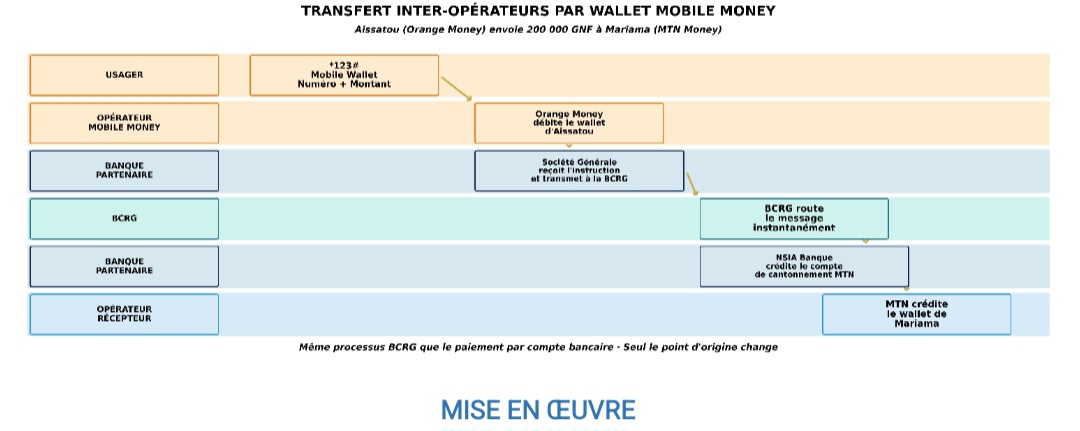 Prenons un exemple. Aissatou (Orange Money) veut envoyer 200 000 GNF à Mariama (MTN Money). Aujourd’hui, les deux opérateurs n’ont pas de mécanisme d’interconnexion directe. Avec le système proposé, Aissatou compose *123#, sélectionne « Mobile Wallet », entre le numéro de Mariama et le montant. Orange Money débite le wallet d’Aissatou et transmet l’instruction à la Société Générale, sa banque partenaire où les fonds des clients Orange Money sont cantonnés. La Société Générale soumet l’instruction de paiement au système de compensation de la BCRG, à destination de NSIA Banque. La BCRG achemine le message instantanément. À réception, NSIA Banque crédite le compte de cantonnement de MTN Money et instruit MTN de créditer le wallet de Mariama. Ce sont les banques qui déplacent l’argent réel ; les opérateurs ajustent les soldes wallet. Si les deux usagers sont chez le même opérateur, la transaction reste interne et ne passe pas par la compensation.